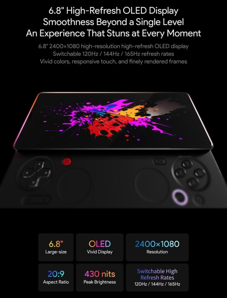 The front of the device is dominated by a large, high-refresh OLED panel.
