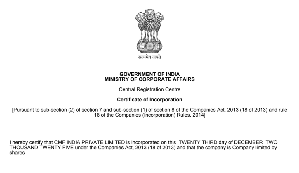 CMF’s Legal Incorporation in India
