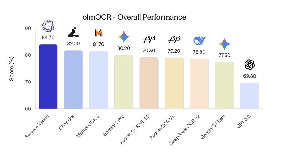 Sarvam Vision recorded 84.3% accuracy on the olmOCR Bench, a competitive evaluation designed to test optical character recognition across difficult document types.